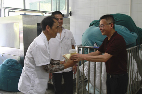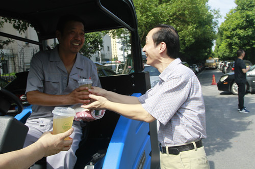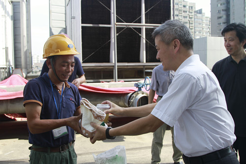 院领导一行深入各高温工作现场,先后来到门诊大楼门口、外环和绿化养护场地、楼顶的中央空调冷却塔维修现场、食堂热厨间、洗衣房、消毒供应中心等,与员工面对面,亲切慰问并送上毛巾、香皂、人丹、风油精和绿豆汤等防暑降温用品。最后,院领导还察看了西区医院正在修建的中轴线南延道路和新建的停车场。