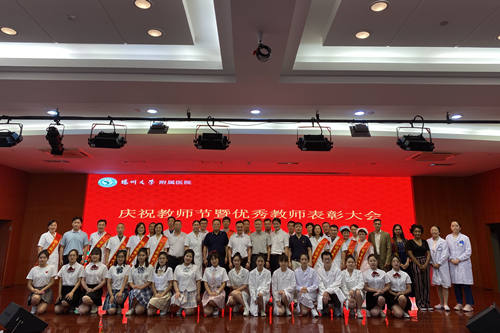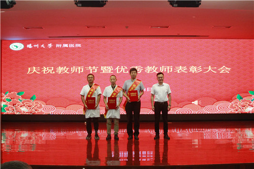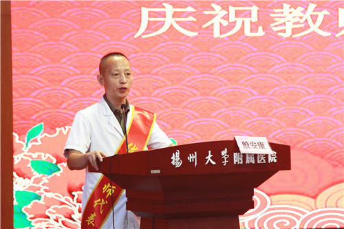 扬州大学附属医院副院长王正兵宣读2018-2020年度院级优秀教师名单;教师代表扬州大学附属医院老年医学科主任、全科医学科副主任殷安康在发言中强调,“行源于心,力生于志。”他表示,从教以来,他时刻不敢忘记自己教育的初心,在教育的路上历练匠心,用自己点点付出,默默践行着一个普普通通人民教师的事业追求。他强调,作为医院的一名临床教师,首先自己要有扎实的医学功底,其次还得学习如何将自己的本领传授给学生。他指出,虽然教学工作很辛苦,但是会督促老师们专业知识的学习和更新。做好教学工作,做一名优秀的临床教师,虽然辛苦,但很骄傲,因为治病救人和教书育人是太阳底下最光辉的职业,在收获学生尊重的同时,也会收获工作带来的快乐,收获这份职业独有的成就感和满足感;学生代表扬州大学研究生张雨嫣在发言中代表全体同学向老师们致以节日的祝福。她说,从古至今,尊师重教一直是中华民族的传统美德,任何人的成长和成才,都离不开老师的培养,社会的每一点进步和更新,无不饱含着老师的辛劳和奉献。每当我们在学习中遇到困难时是老师帮我们答疑解感,传给我们终生受用的宝贵财富,此时他们仿佛是我们手中的百宝箱;在人生旅途中,当我们彷徨,找不到正确的前行方向时,是老师带领我们走出困境,此时他们又像是一盏指路明灯;在我们感到孤独无助时,又是老师陪在我们身边,给我们温暖,此时的他们又仿佛是可供依靠的温馨港湾。