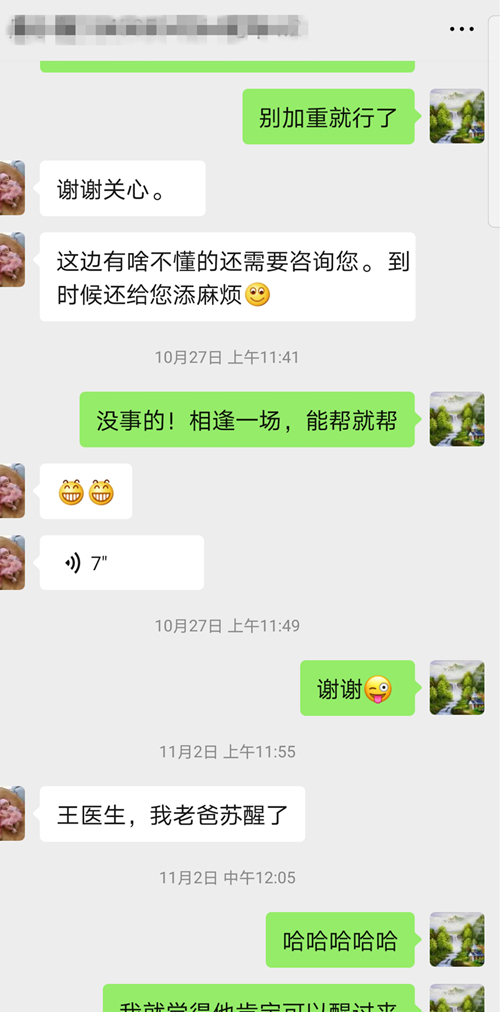 每隔6个小时,王友伟与患者家属保持联系一次,一直到他们回家才放松一口气。“王医生,我老爸苏醒了!”终于,王友伟及其所在的医疗组最想看到的结果出现了,大家激动极了!