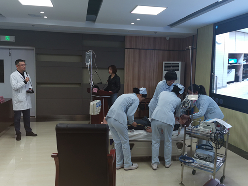 在工作坊环节,冷俊岭、陈梅青、西区输液室王静护士长、徐炳超,徐颖、徐佳护士为大家展示了高效团队心肺复苏的场景,他们以情景案例导入,模拟急诊抢救的医护配合与有效沟通,展现了急诊医护人员的实战能力、团队配合能力,以提高心肺复苏的抢救成功率。